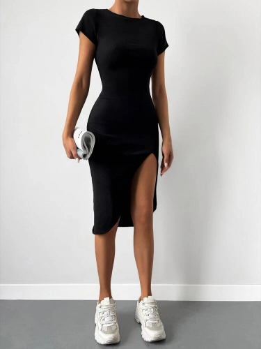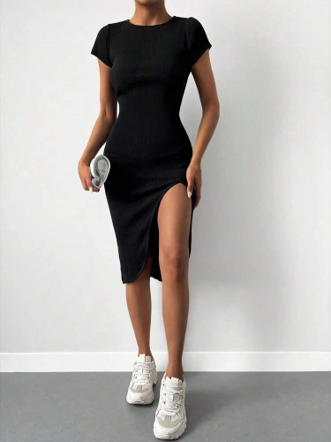 Damska sukienka na ramiączkach z krótkim rękawem i okrągłym dekoltem, z głębokim rozcięciem