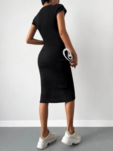 • Damska sukienka na ramiączkach z krótkim rękawem i okrągłym dekoltem, z głębokim rozcięciem
