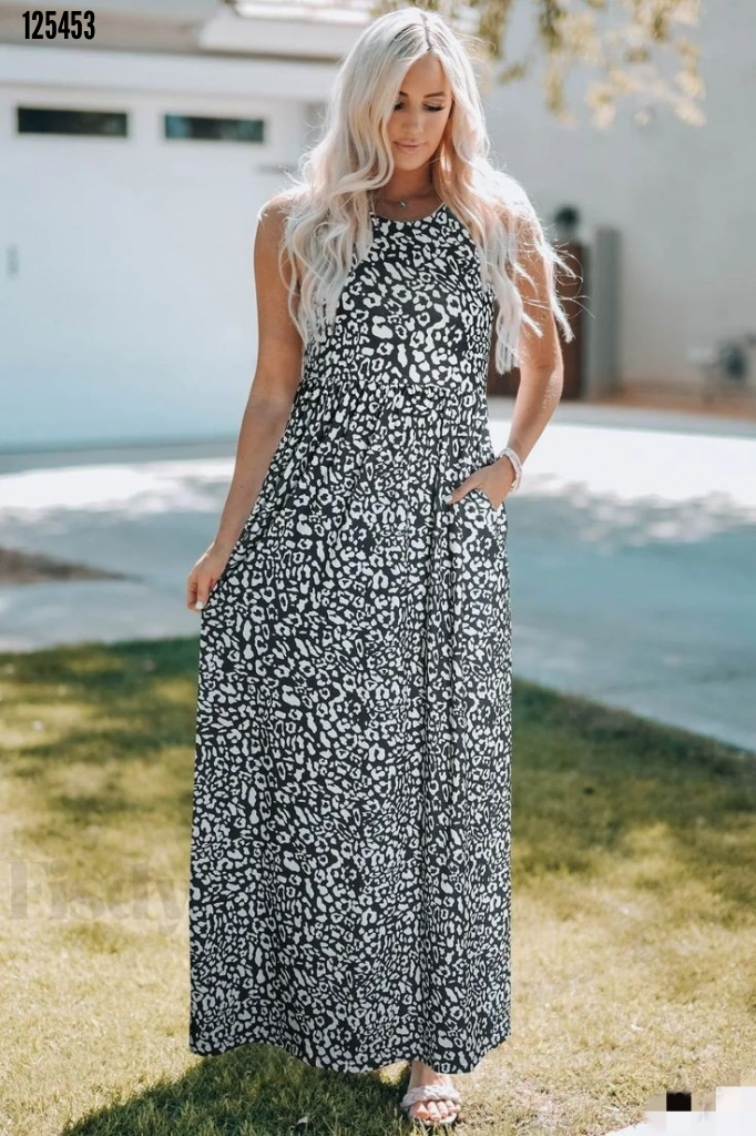 • Damska gruba sukienka maxi z okrągłym dekoltem i kieszeniami z pojedynczego jerseyu