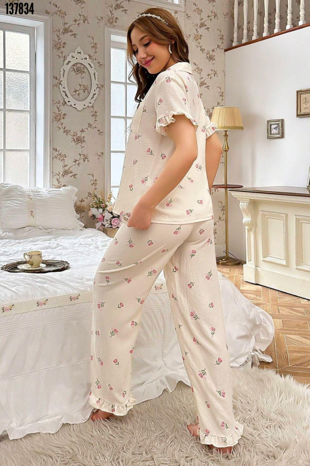 • Ecru kwiatowy wzór piżamy z kołnierzykiem 7036