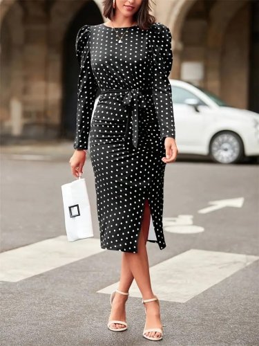 • Damska sukienka z dzianiny krepowej z długim rękawem i okrągłym dekoltem, wiązana z przodu i rozcięciem
