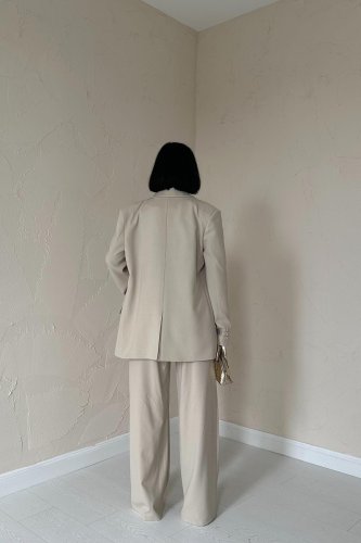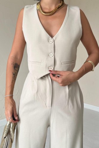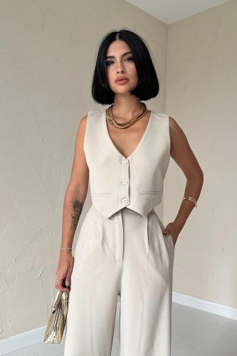 • Beżowy elegancki komplet: marynarka, kamizelka i spodnie