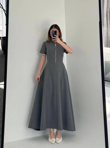 • Sukienka z krótkim rękawem i rozpinaną spódnicą dzwonkową z przodu - antracytowa