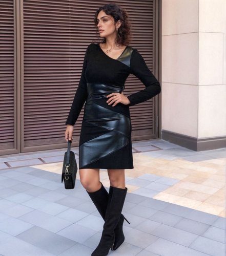 Damska sukienka mini z długim rękawem i asymetrycznym dekoltem, wykonana ze zamszu i skóry