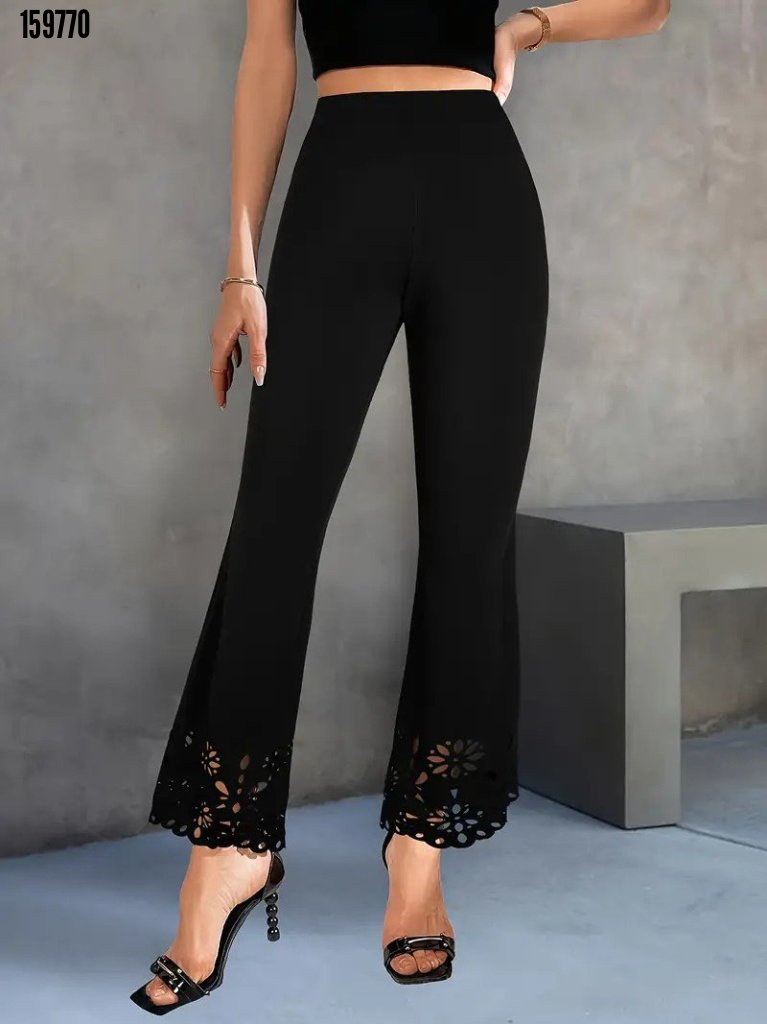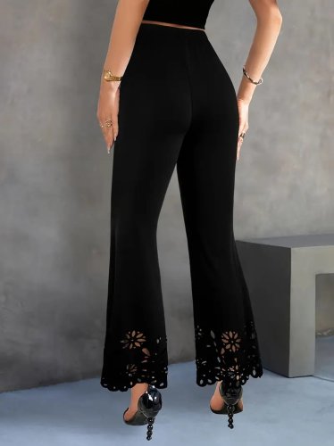 • Damskie spodnie z wysokim stanem, importowane z krepy, z wycinanym laserowo kwiatem, rozszerzające się ku nogawce