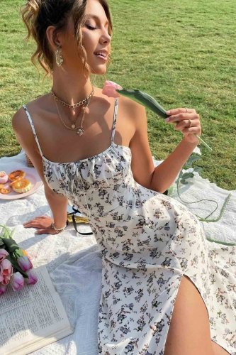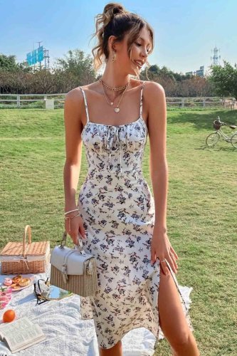 • Sukienka damska z wzorem z pojedynczej dzianiny, z paskiem na sznurku i wiązaniem przy szyi