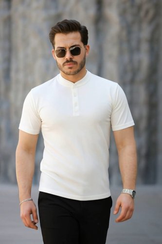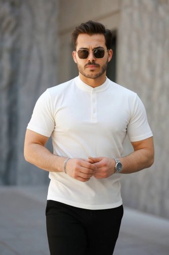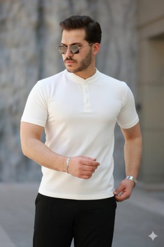• Męska bluzka wiskozowa z krótkim rękawem, okrągłym dekoltem i zapięciem na guziki