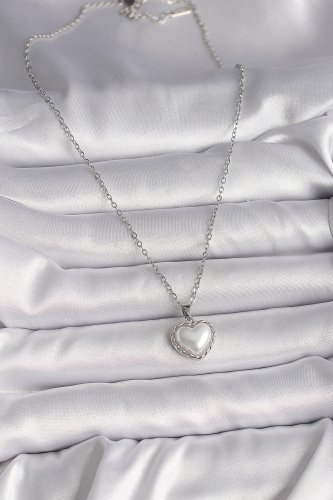 Naszyjnik damski z łańcuszkiem w kolorze srebrnym, ze stali 316L, z perłami 3D i wzorem serca