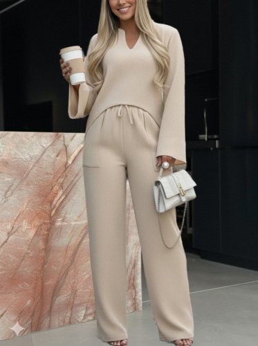 • Dwuczęściowy damski garnitur z długim rękawem, dekoltem w serek, lnianą bluzką i sznurowanymi spodniami