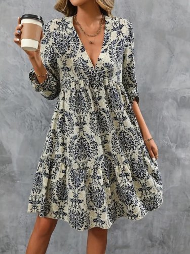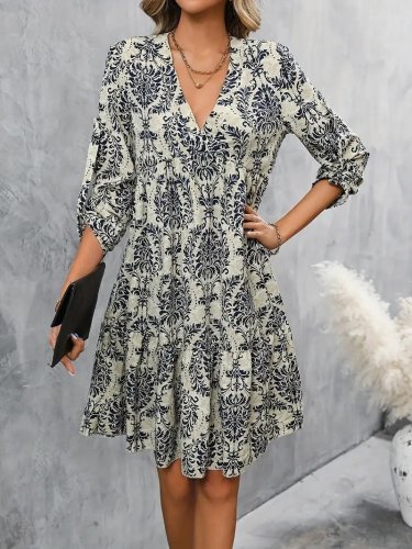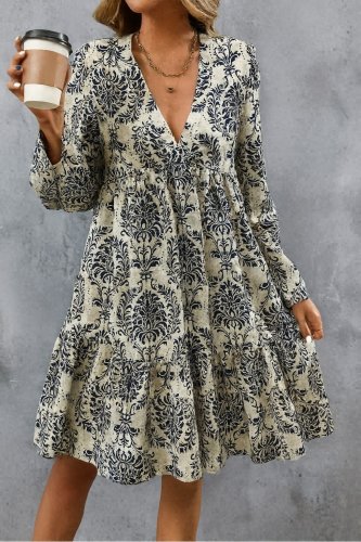 Damska sukienka mini z długim rękawem i dekoltem w serek, z falbanką