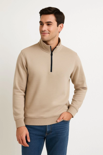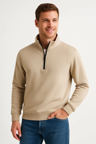 • Męska bluza z kołnierzem stójkowym, zapinana na zamek błyskawiczny, 3-nitkowa, podniesiona bawełna, beżowa