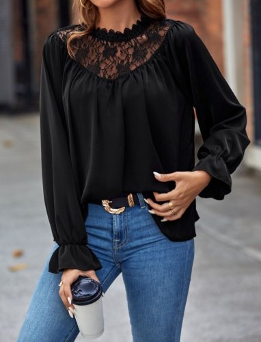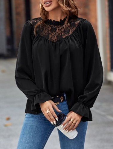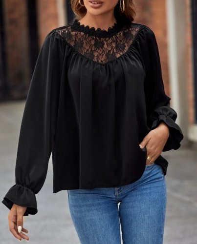 Damska bluzka z długim rękawem, koronkowa, luźna, piaskowa