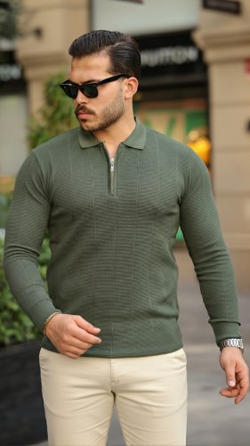 Męska dzianinowa odzież z długim rękawem i kołnierzykiem w kolorze ryżu