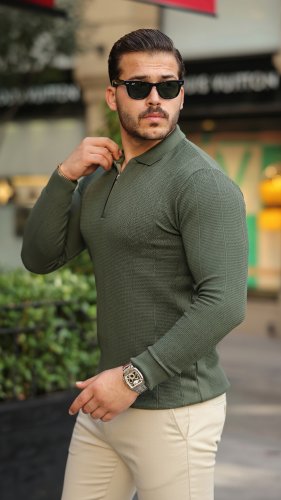 • Męska dzianinowa odzież z długim rękawem i kołnierzykiem w kolorze ryżu