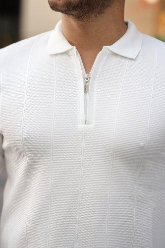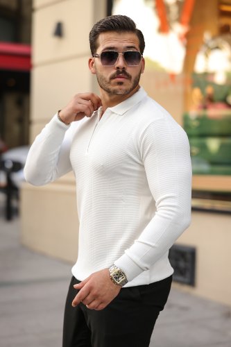 • Męska dzianinowa odzież z długim rękawem i kołnierzykiem w kolorze ryżu