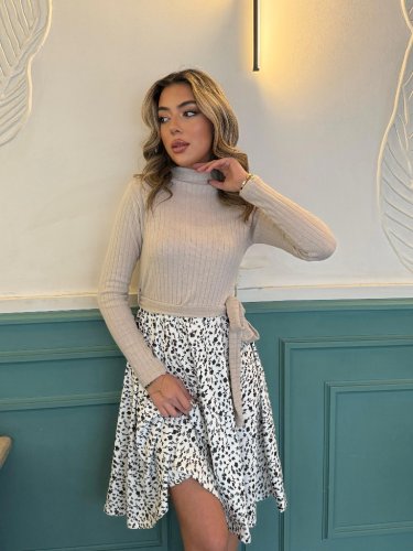 • Damska sukienka z długim rękawem, golfem, wiązaniem w talii i spódnicą na ramiączkach, krótka, typu scuba