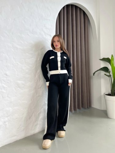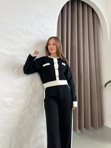 • Damski garnitur dzianinowy z długim rękawem i pasiastymi detalami