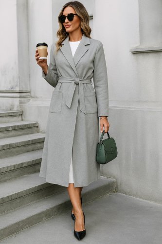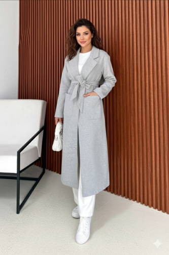 • Płaszcz damski z kaszmiru za kolano, z kieszeniami i paskiem w talii