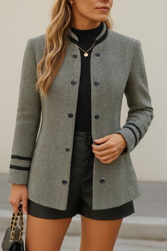 • Damska krótka kurtka tkana z długim rękawem i kołnierzykiem typu stójka, zapinana na guziki