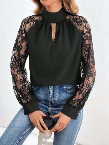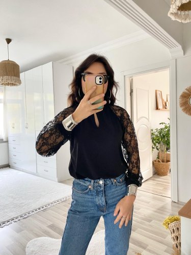• Bluzka damska z długim rękawem, dekoltem typu golf, tiulem i piaskowym wzorem