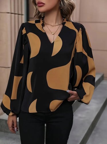 Bluzka damska z długim rękawem i dekoltem w serek, z modalu we wzory