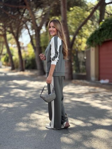 • Dwurzędowy kardigan damski z okrągłym dekoltem i szerokimi nogawkami