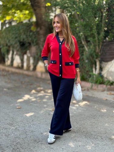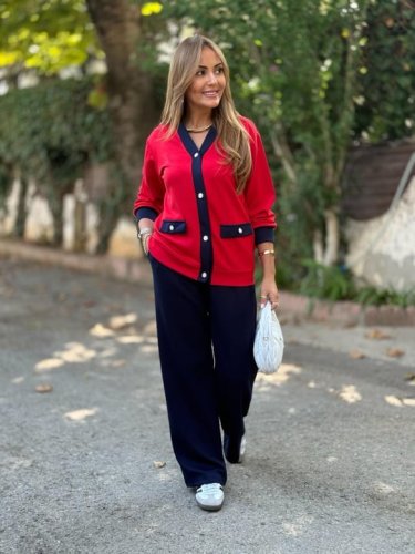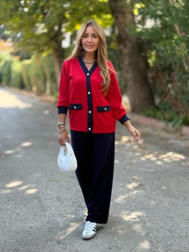 • Dwuczęściowy komplet damski składający się z kardiganu z długim rękawem i kieszeniami oraz spodni z szerokimi nogawkami