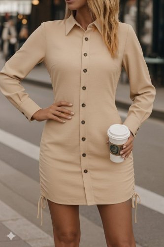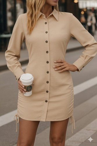 • Damska sukienka do aerobiku z długim rękawem, kołnierzykiem koszulowym, zapinana z przodu na guziki, marszczona z boku