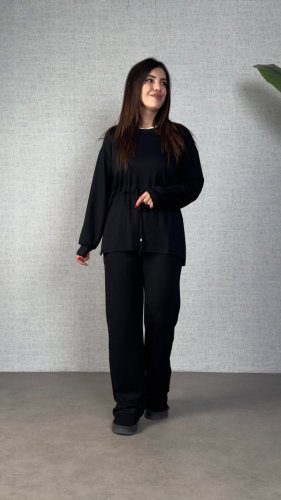 • Dwuczęściowy damski komplet tunika i spodnie z długim rękawem i kołnierzykiem oraz marszczeniami