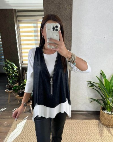 • Dwuczęściowy komplet damski składający się z bluzki wiskozowej z długim rękawem i asymetrycznym krojem oraz kamizelki z efektem popękanej skóry
