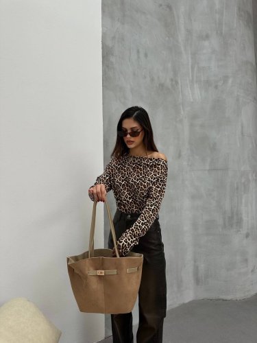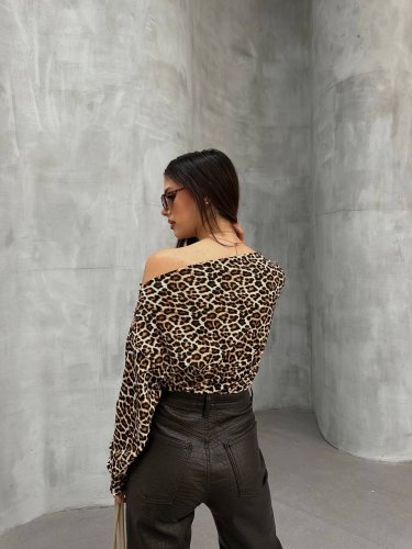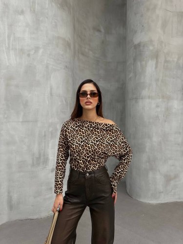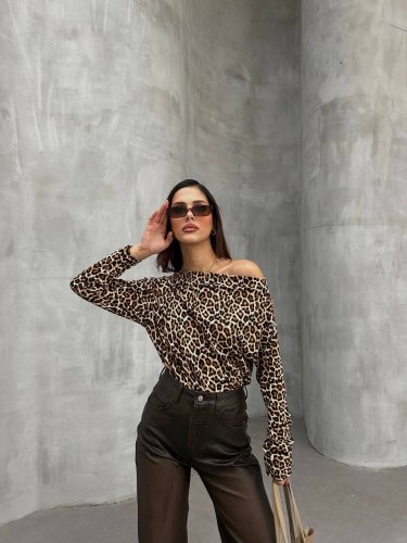 • Bluzka damska z odkrytymi ramionami i nadrukiem w panterkę