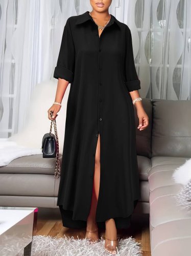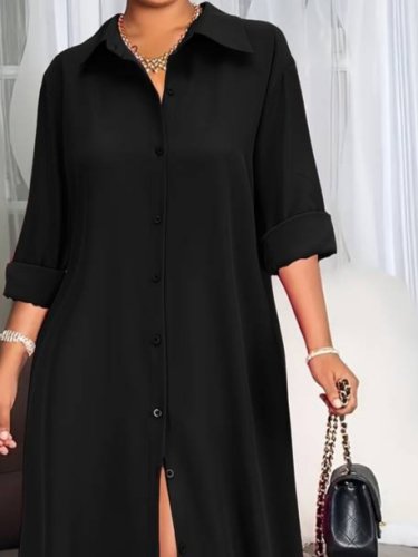 Damska sukienka z długim rękawem, kołnierzykiem, zapinana z przodu na guziki, wykonana z tkaniny