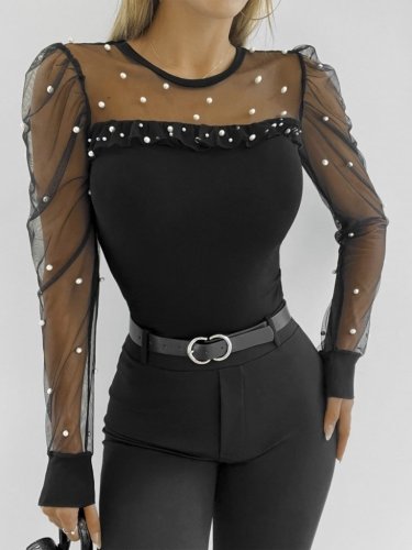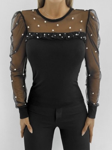 • Bluzka damska z długim rękawem, tiulem i wiskozą, zdobiona perłami
