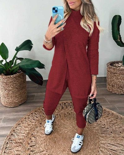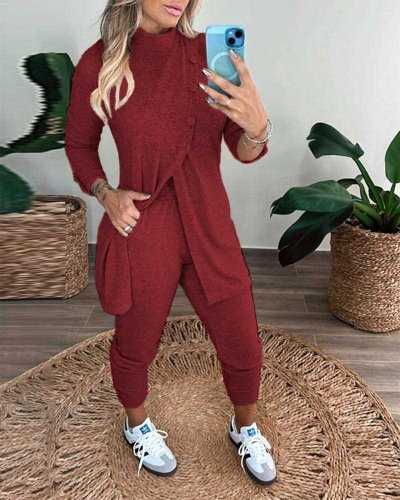 Damski dwuczęściowy komplet z bluzką i spodniami z długim rękawem i golfem zapinanym z przodu na guziki