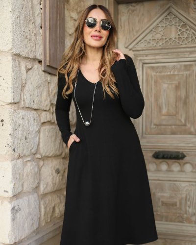 • Damska sukienka midi z długim rękawem i dekoltem w serek, wykonana z akrylu
