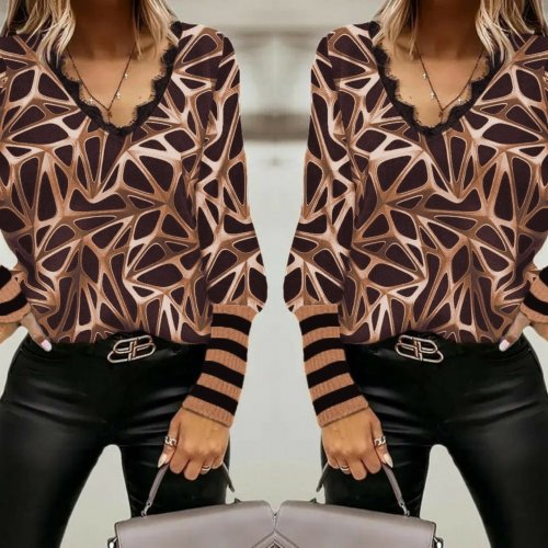 • Damska bluzka scuba z długim rękawem i dekoltem w serek, z gipiurowymi zdobieniami na brzegach