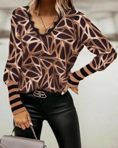 Damska bluzka scuba z długim rękawem i dekoltem w serek, z gipiurowymi zdobieniami na brzegach