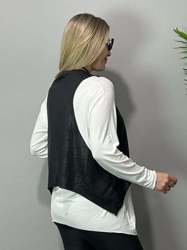 Czarny skórzany damski garnitur z kamizelką i naszyjnikiem, trzyczęściowy