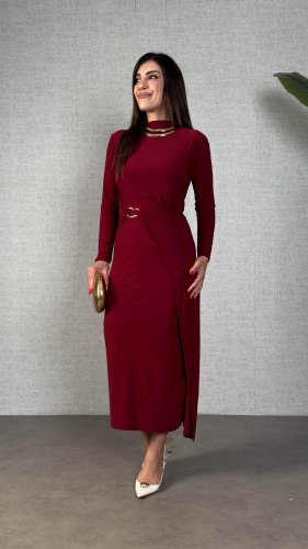 • Damska sukienka midi z golfem i ozdobnymi klamrami z materiału w kolorze piaskowym