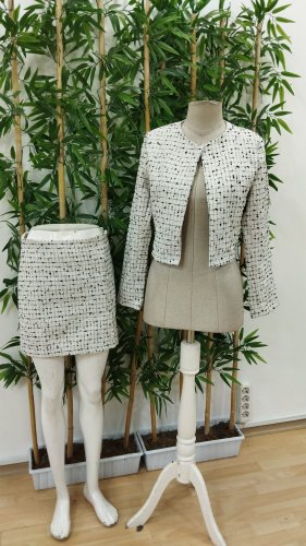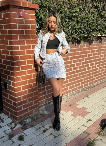 • Dwuczęściowy komplet damski składający się z kurtki z długim rękawem i rozpiętą z przodu mini spódniczką