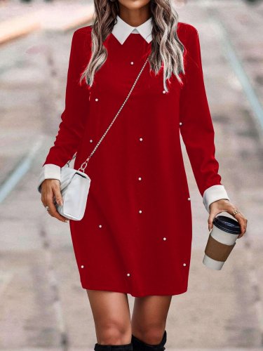 Damska sukienka z krepy z długim rękawem i golfem, zdobiona perłami
