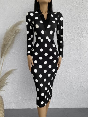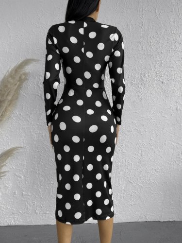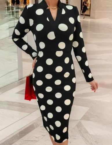Damska sukienka midi z krepy w groszki, z długim rękawem i dekoltem w serek