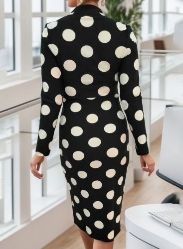 • Damska sukienka midi z krepy w groszki, z długim rękawem i dekoltem w serek