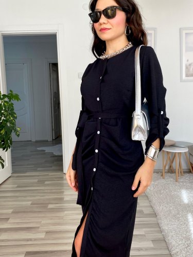 • Damska sukienka do aerobiku midi z długim rękawem i guzikami z przodu, zapinana w talii i z paskiem