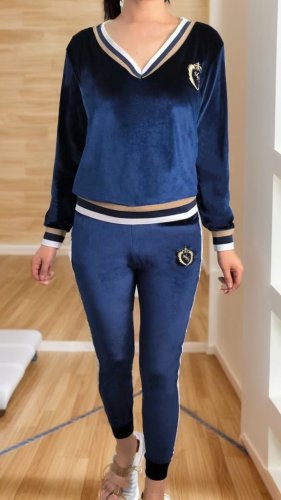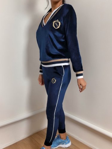 Damski aksamitny garnitur z długim rękawem, dekoltem w serek i mankietami w paski