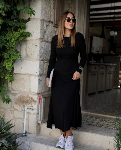 • Długa sukienka damska z długim rękawem i okrągłym dekoltem na plecach, wykonana z dwunitkowej wiskozy