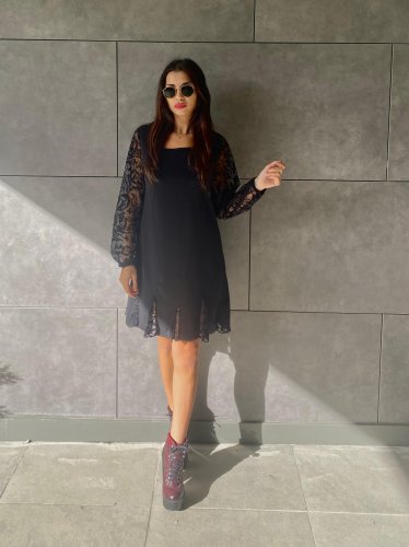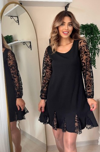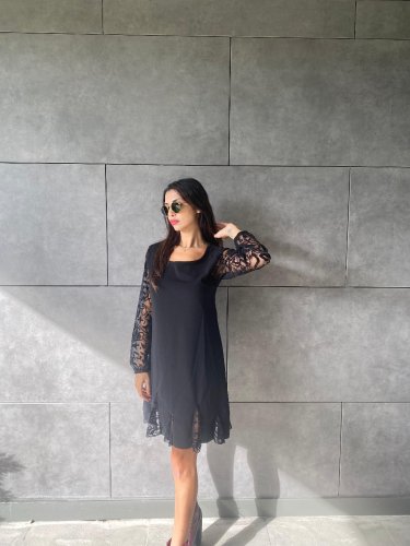 • Damska sukienka z długim rękawem, okrągłym dekoltem, krótka, importowana, z krepy, z koronką na rękawach i dole