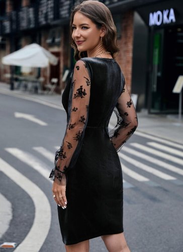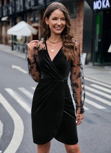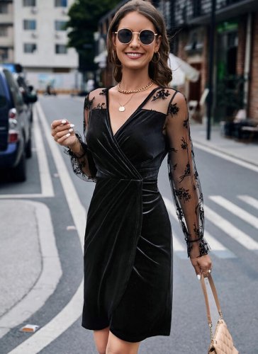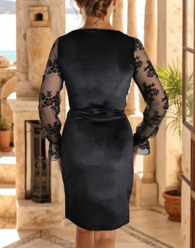 • Damska sukienka mini z długim rękawem, dwurzędowym kołnierzykiem, tiulowymi rękawami i elastyczną talią z aksamitu