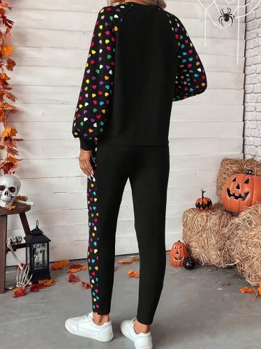 Dwuczęściowy garnitur damski z długim rękawem, okrągłym dekoltem, wzorzystą bluzką i spodniami z wiskozy