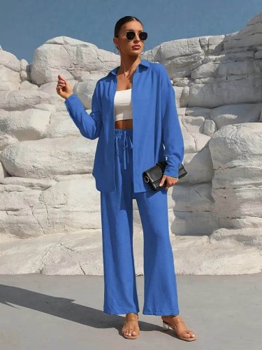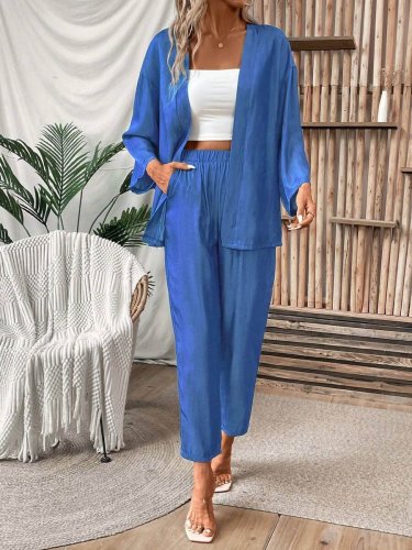 • Dwuczęściowy damski garnitur z długim rękawem, otwartą z przodu kurtką i spodniami, wykonany z tkaniny